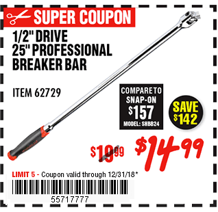 1/2" DRIVE 25" PROFESSIONAL BREAKER BAR Lot No. 62729 Expired: 12/31/18 - $14.99 Coupon Code: '55717777'