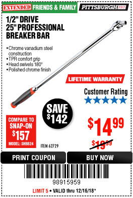 1/2" DRIVE 25" PROFESSIONAL BREAKER BAR Lot No. 62729 Expired: 12/16/18 - $14.99 Coupon Code: '98915959'