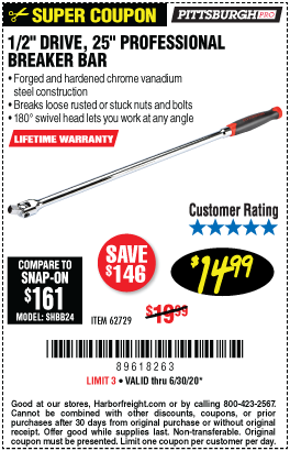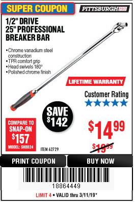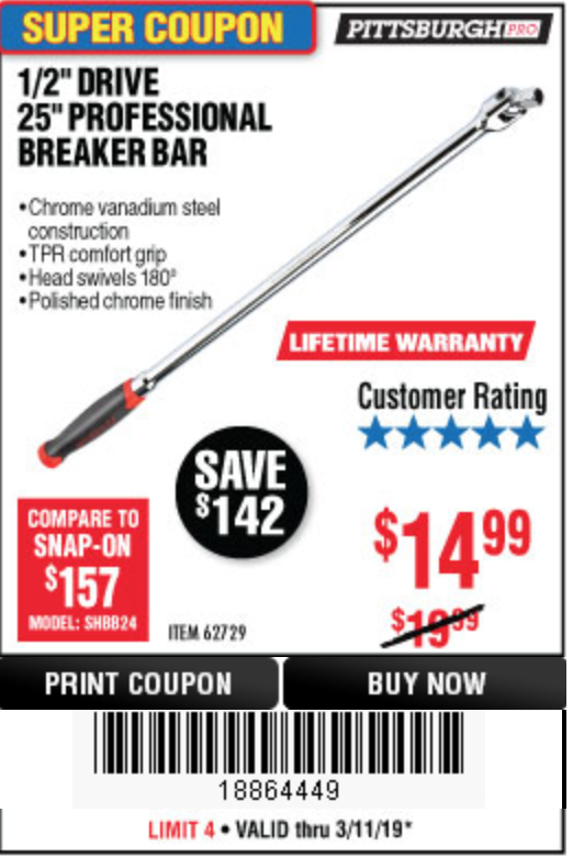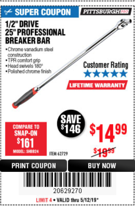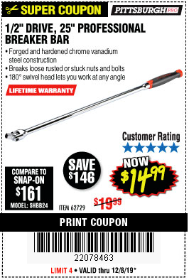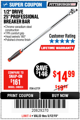 1/2" DRIVE 25" PROFESSIONAL BREAKER BAR Lot No. 62729 Expired: 5/12/19 - $14.99 Coupon Code: '20629270'