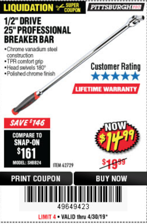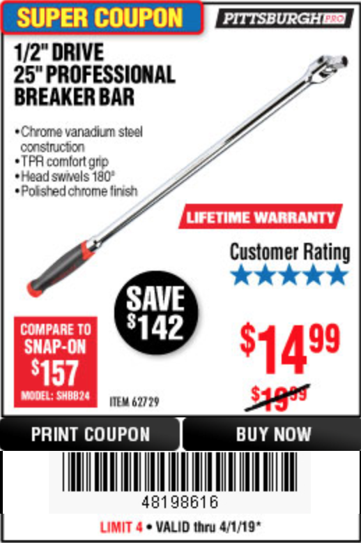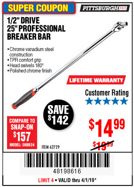 1/2" DRIVE 25" PROFESSIONAL BREAKER BAR Lot No. 62729 Expired: 4/1/19 - $14.99 Coupon Code: '48198616'