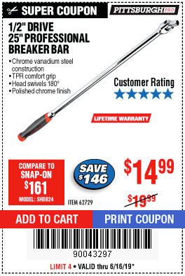 1/2" DRIVE 25" PROFESSIONAL BREAKER BAR Lot No. 62729 Expired: 6/16/19 - $14.99 Coupon Code: '90043297'