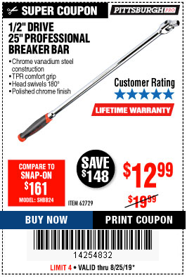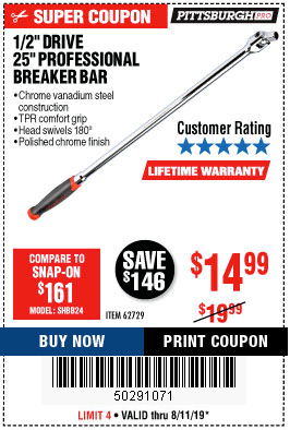1/2" DRIVE 25" PROFESSIONAL BREAKER BAR Lot No. 62729 Expired: 8/11/19 - $14.99 Coupon Code: '50291071'