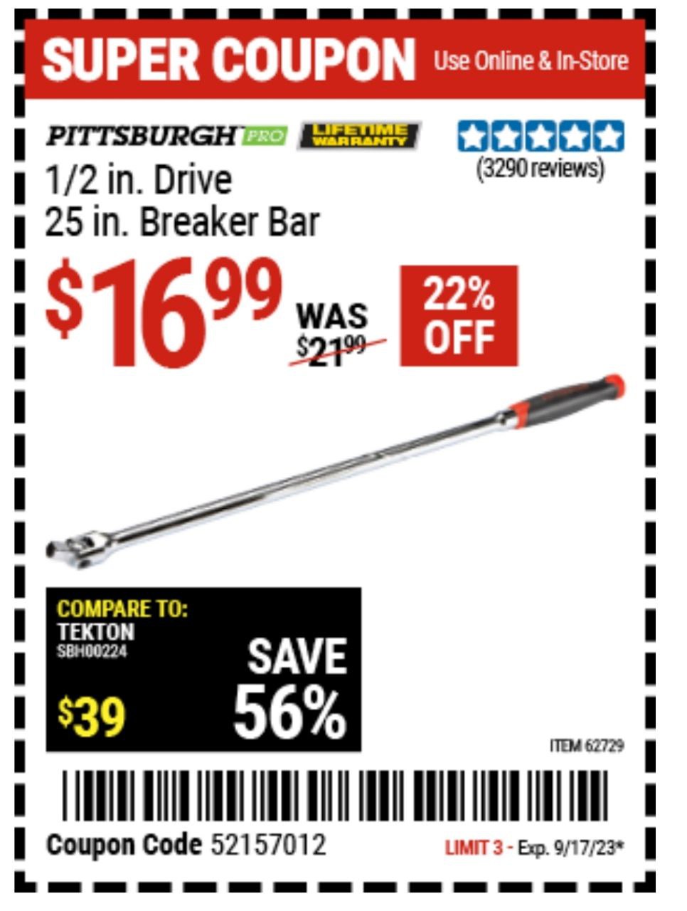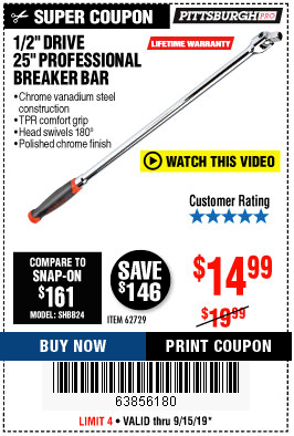 1/2" DRIVE 25" PROFESSIONAL BREAKER BAR Lot No. 62729 Expired: 9/15/19 - $14.99 Coupon Code: '63856180'