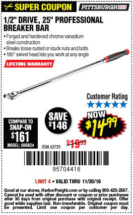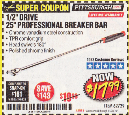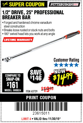 1/2" DRIVE 25" PROFESSIONAL BREAKER BAR Lot No. 62729 Expired: 11/30/19 - $14.99 Coupon Code: '23615011'