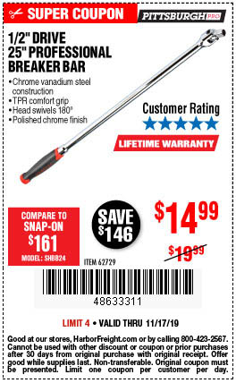1/2" DRIVE 25" PROFESSIONAL BREAKER BAR Lot No. 62729 Expired: 5/6/19 - $14.99 Coupon Code: '67761128'