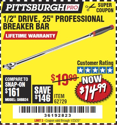 1/2" DRIVE 25" PROFESSIONAL BREAKER BAR Lot No. 62729 Expired: 1/23/20 - $14.99 Coupon Code: '36192823'