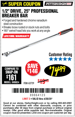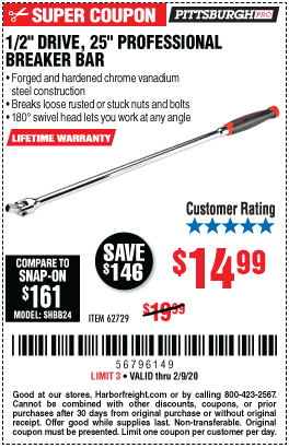1/2" DRIVE 25" PROFESSIONAL BREAKER BAR Lot No. 62729 Expired: 2/23/20 - $14.99 Coupon Code: '97726498'