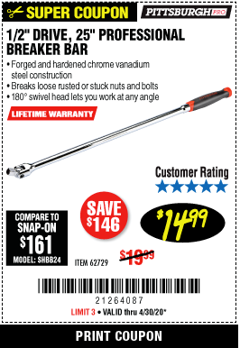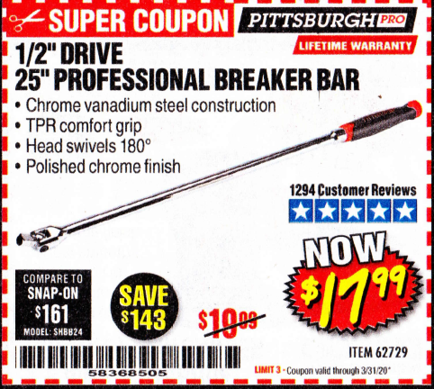 1/2" DRIVE 25" PROFESSIONAL BREAKER BAR Lot No. 62729 Expired: 3/31/20 - $17.99 Coupon Code: '58368505'