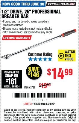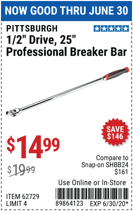1/2" DRIVE 25" PROFESSIONAL BREAKER BAR Lot No. 62729 Expired: 6/30/20 - $14.99 Coupon Code: '89864123'