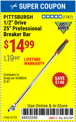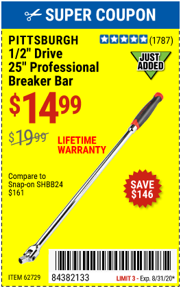 1/2" DRIVE 25" PROFESSIONAL BREAKER BAR Lot No. 62729 Expired: 8/31/20 - $14.99 Coupon Code: '84435340'