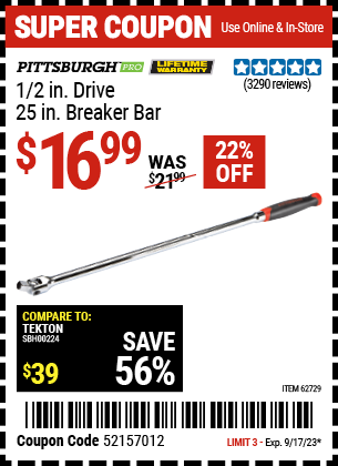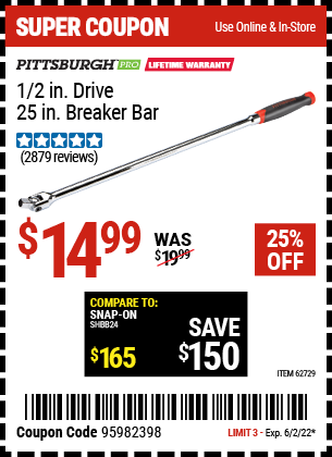 1/2" DRIVE 25" PROFESSIONAL BREAKER BAR Lot No. 62729 Expired: 6/2/22 - $14.99 Coupon Code: '95982398'