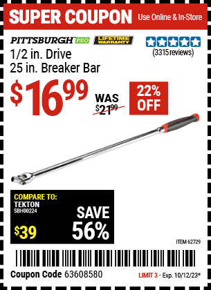 1/2" DRIVE 25" PROFESSIONAL BREAKER BAR Lot No. 62729 Expired: 10/12/23 - $16.99 Coupon Code: '63608580'