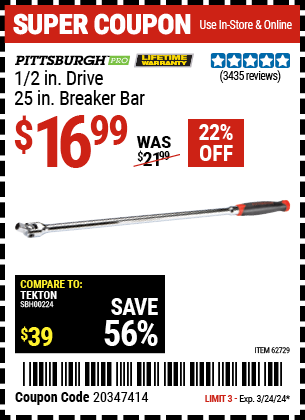 1/2" DRIVE 25" PROFESSIONAL BREAKER BAR Lot No. 62729 Expired: 3/24/24 - $16.99 Coupon Code: '20347414'