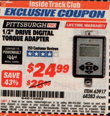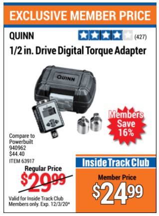 1/2" DRIVE DIGITAL TORQUE ADAPTER Lot No. 68283/63917 Expired: 10/28/18 - $24.99 Coupon Code: '29194226'