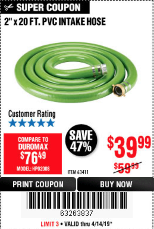 2 IN. X 20 FT. PVC SUCTION/INTAKE HOSE Lot No. 63411 Expired: 4/14/19 - $39.99 Coupon Code: '63263837'