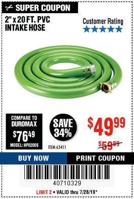 2 IN. X 20 FT. PVC SUCTION/INTAKE HOSE Lot No. 63411 Expired: 7/28/19 - $49.99 Coupon Code: '40710329'