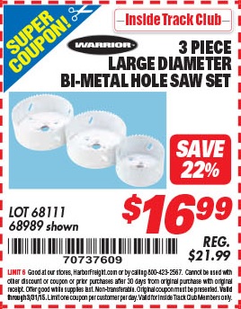 ITC 3 PIECE LARGE DIAMETER BI-METAL HOLE SAW SET Lot No. 68111/68989 Expired: 3/31/15 - $16.99 Coupon Code: '70737609'