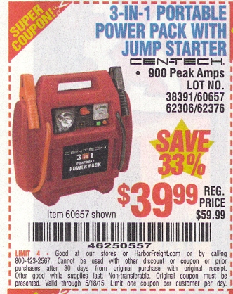 3-IN-1 PORTABLE POWER PACK WITH JUMP STARTER Lot No. 38391/60657/62306/62376/64083 Expired: 6/8/15 - $39.99 Coupon Code: '43084728'