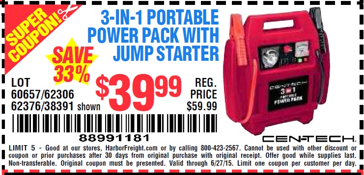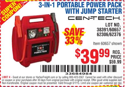 3-IN-1 PORTABLE POWER PACK WITH JUMP STARTER Lot No. 38391/60657/62306/62376/64083 Expired: 6/1/15 - $39.99 Coupon Code: '33684984'