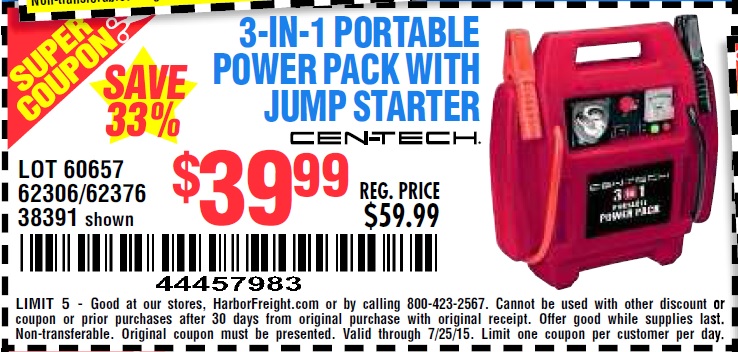 3-IN-1 PORTABLE POWER PACK WITH JUMP STARTER Lot No. 38391/60657/62306/62376/64083 Expired: 7/25/15 - $39.99 Coupon Code: '44457983'
