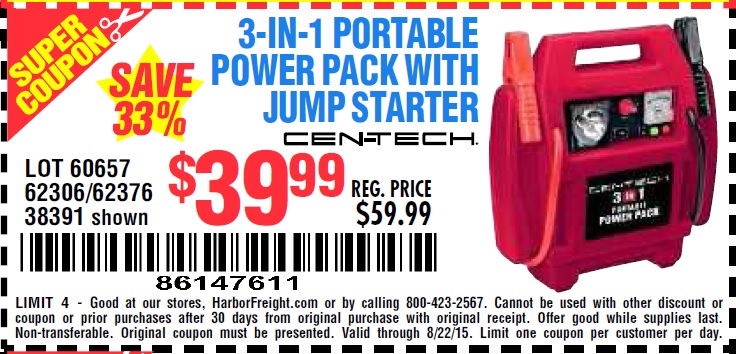 3-IN-1 PORTABLE POWER PACK WITH JUMP STARTER Lot No. 38391/60657/62306/62376/64083 Expired: 8/22/15 - $39.99 Coupon Code: '86147611'