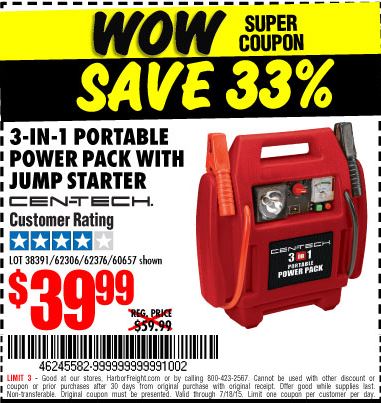3-IN-1 PORTABLE POWER PACK WITH JUMP STARTER Lot No. 38391/60657/62306/62376/64083 Expired: 7/18/15 - $39.99 Coupon Code: '46245582'