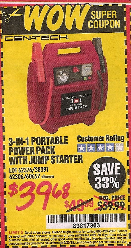 3-IN-1 PORTABLE POWER PACK WITH JUMP STARTER Lot No. 38391/60657/62306/62376/64083 Expired: 9/30/15 - $39.68 Coupon Code: '83817303'