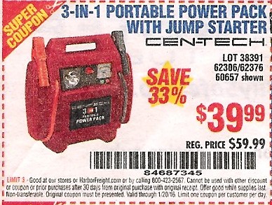 3-IN-1 PORTABLE POWER PACK WITH JUMP STARTER Lot No. 38391/60657/62306/62376/64083 Expired: 1/20/16 - $39.99 Coupon Code: '84687345'