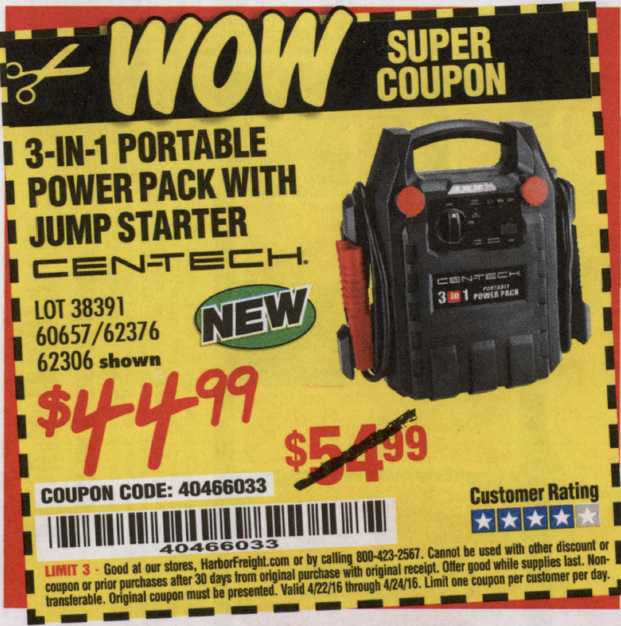3-IN-1 PORTABLE POWER PACK WITH JUMP STARTER Lot No. 38391/60657/62306/62376/64083 Expired: 4/24/16 - $44.99 Coupon Code: '40466033'