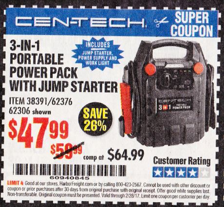 3-IN-1 PORTABLE POWER PACK WITH JUMP STARTER Lot No. 38391/60657/62306/62376/64083 Expired: 2/28/17 - $47.99 Coupon Code: '60940845'
