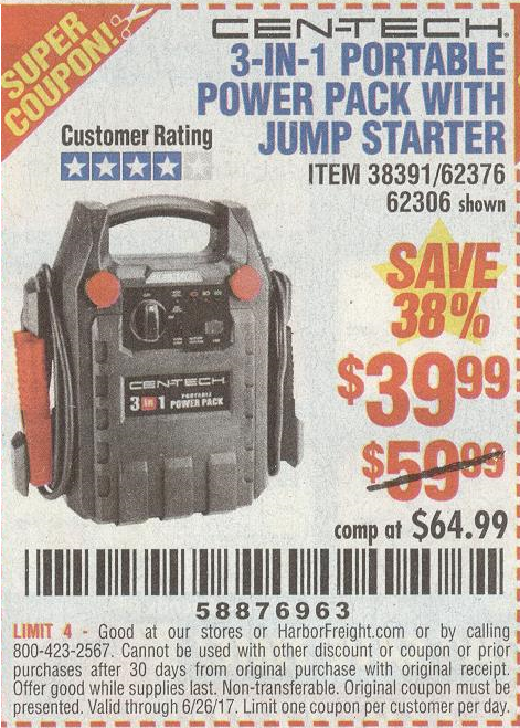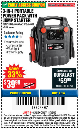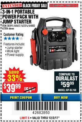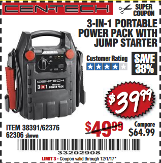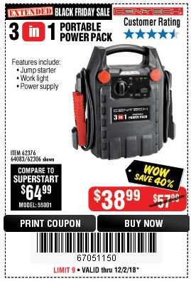 3-IN-1 PORTABLE POWER PACK WITH JUMP STARTER Lot No. 38391/60657/62306/62376/64083 Expired: 12/1/17 - $39.99 Coupon Code: '33202908'