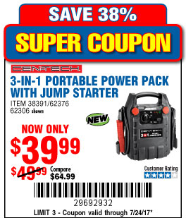 3-IN-1 PORTABLE POWER PACK WITH JUMP STARTER Lot No. 38391/60657/62306/62376/64083 Expired: 7/24/17 - $39.99 Coupon Code: '29692932'