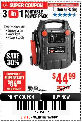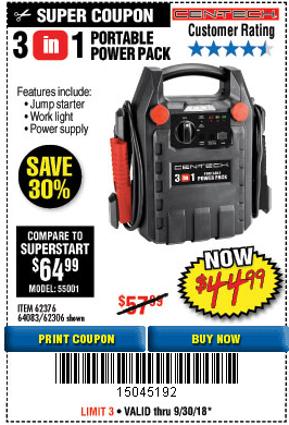 3-IN-1 PORTABLE POWER PACK WITH JUMP STARTER Lot No. 38391/60657/62306/62376/64083 Expired: 9/23/18 - $44.99 Coupon Code: '16495877'