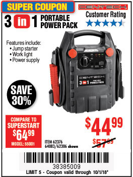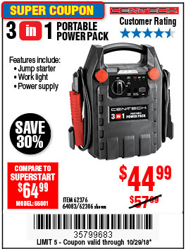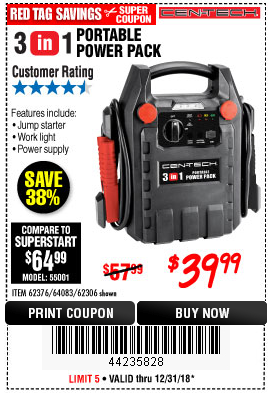 3-IN-1 PORTABLE POWER PACK WITH JUMP STARTER Lot No. 38391/60657/62306/62376/64083 Expired: 10/1/18 - $44.99 Coupon Code: '38385009'