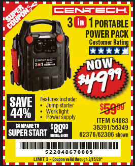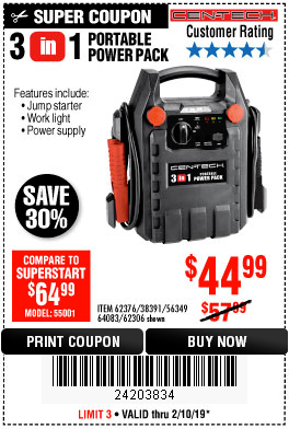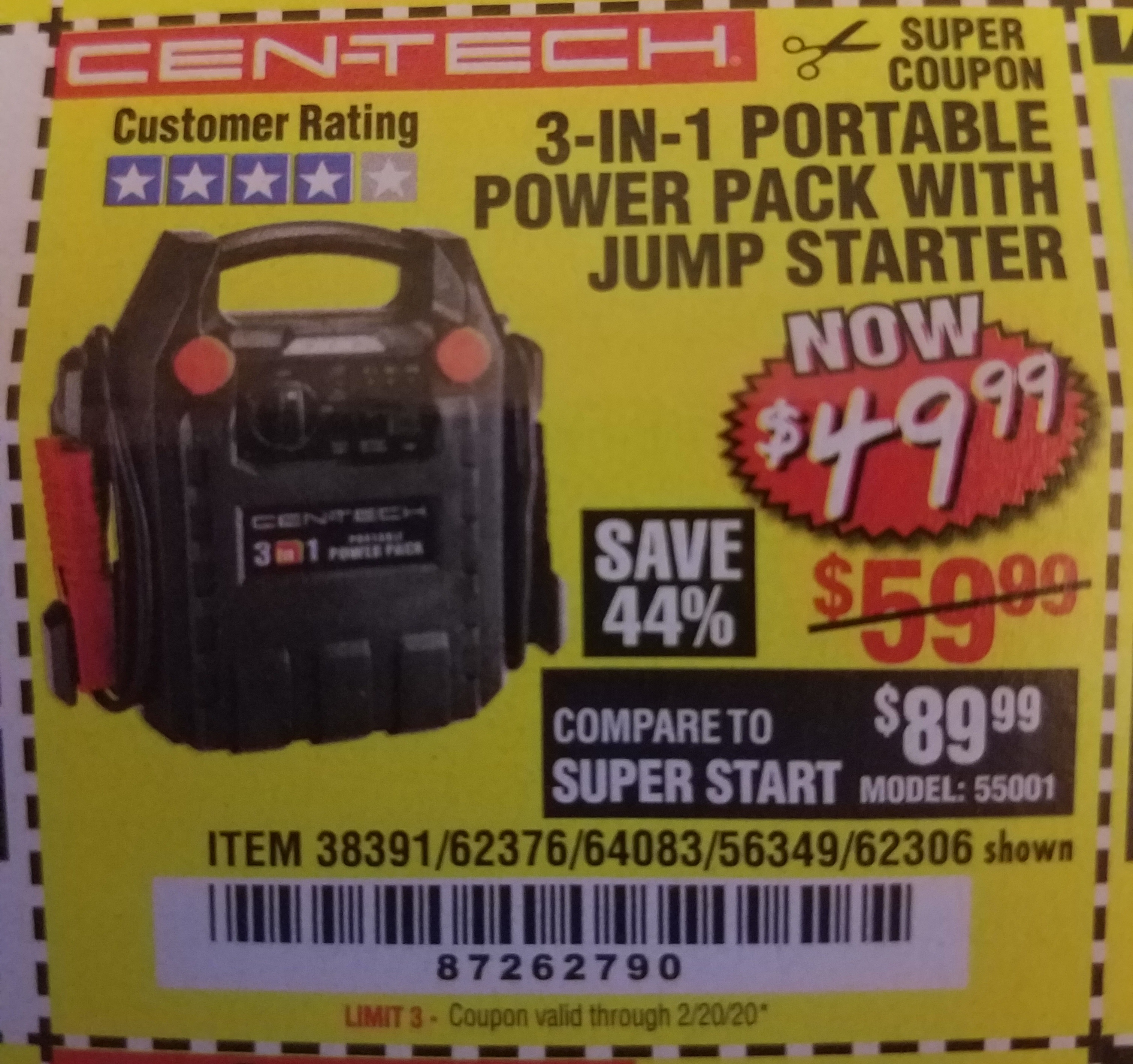 3-IN-1 PORTABLE POWER PACK WITH JUMP STARTER Lot No. 38391/60657/62306/62376/64083 Expired: 2/15/20 - $49.99 Coupon Code: '52204867'