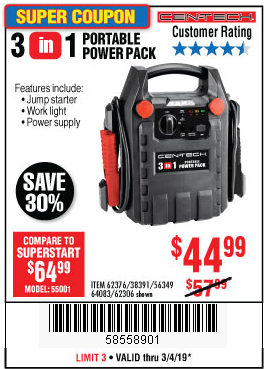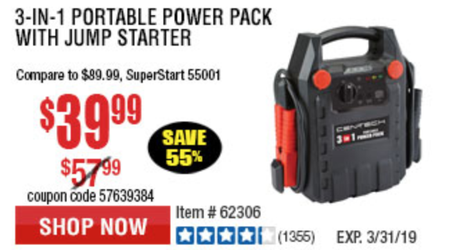 3-IN-1 PORTABLE POWER PACK WITH JUMP STARTER Lot No. 38391/60657/62306/62376/64083 Expired: 3/31/19 - $39.99 Coupon Code: '61665031'
