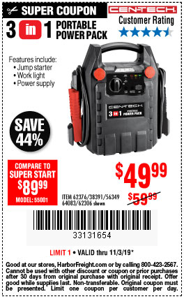 3-IN-1 PORTABLE POWER PACK WITH JUMP STARTER Lot No. 38391/60657/62306/62376/64083 Expired: 11/3/19 - $49.99 Coupon Code: '33131654'