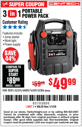 3-IN-1 PORTABLE POWER PACK WITH JUMP STARTER Lot No. 38391/60657/62306/62376/64083 Expired: 1/1/20 - $49.99 Coupon Code: '83703800'