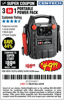 3-IN-1 PORTABLE POWER PACK WITH JUMP STARTER Lot No. 38391/60657/62306/62376/64083 Expired: 3/31/20 - $49.99 Coupon Code: '36724864'