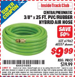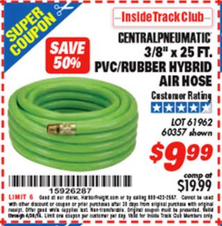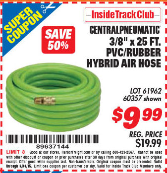 ITC 3/8" x 25 FT. PVC/RUBBER HYBRID AIR HOSE Lot No. 60357/61962 Expired: 4/30/16 - $9.99 Coupon Code: '15926287'