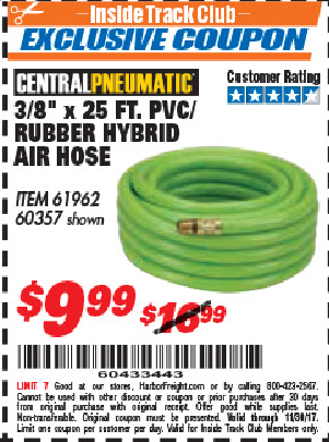 ITC 3/8" x 25 FT. PVC/RUBBER HYBRID AIR HOSE Lot No. 60357/61962 Expired: 11/30/17 - $9.99 Coupon Code: '60433443'