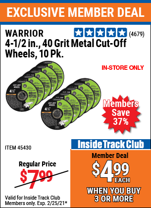 ITC 4-1/2" 40 GRIT METAL CUT-OFF WHEEL, 10 PACK Lot No. 45430/61195 Expired: 2/25/21 - $4.99 Coupon Code: '12748167'