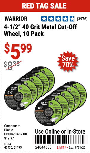 4-1/2" 40 GRIT METAL CUT-OFF WHEEL, 10 PACK Lot No. 45430/61195 Expired: 8/31/20 - $5.99 Coupon Code: '24044688'