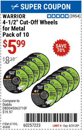 4-1/2" 40 GRIT METAL CUT-OFF WHEEL, 10 PACK Lot No. 45430/61195 Expired: 8/31/20 - $5.99 Coupon Code: '60257223'