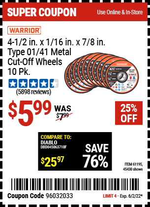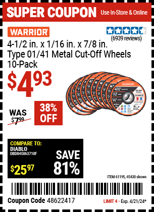4-1/2" 40 GRIT METAL CUT-OFF WHEEL, 10 PACK Lot No. 45430/61195 Expired: 6/2/22 - $5.99 Coupon Code: '95994643'