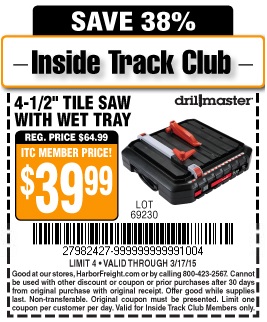 ITC 4-1/2" TILE SAW WITH WET TRAY Lot No. 3733/69230 Expired: 3/17/15 - $39.99 Coupon Code: '27982427'