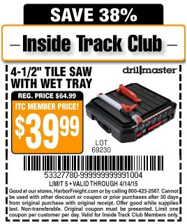 ITC 4-1/2" TILE SAW WITH WET TRAY Lot No. 3733/69230 Expired: 5/19/15 - $39.99 Coupon Code: '31455122'