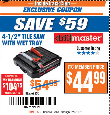 ITC 4-1/2" TILE SAW WITH WET TRAY Lot No. 3733/69230 Expired: 2/28/19 - $44.99 Coupon Code: '17270323'