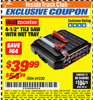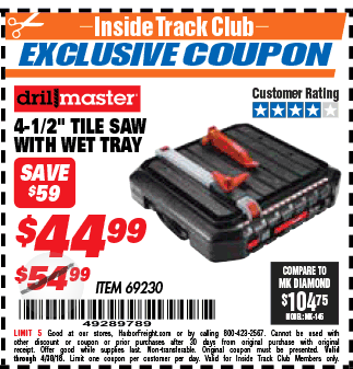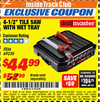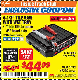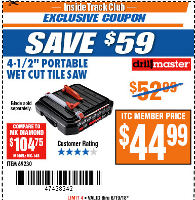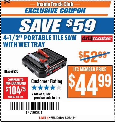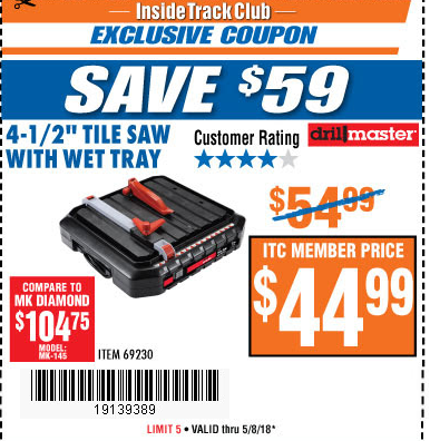 ITC 4-1/2" TILE SAW WITH WET TRAY Lot No. 3733/69230 Expired: 7/31/18 - $39.99 Coupon Code: '12499934'