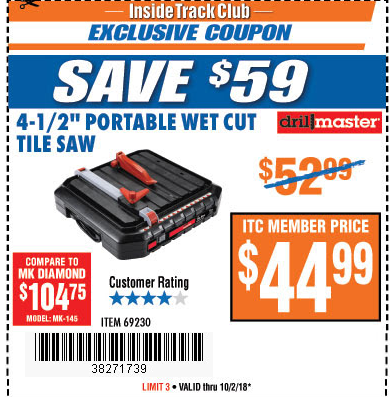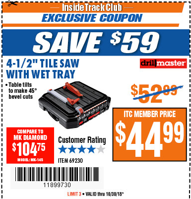 ITC 4-1/2" TILE SAW WITH WET TRAY Lot No. 3733/69230 Expired: 10/2/18 - $44.99 Coupon Code: '38271739'
